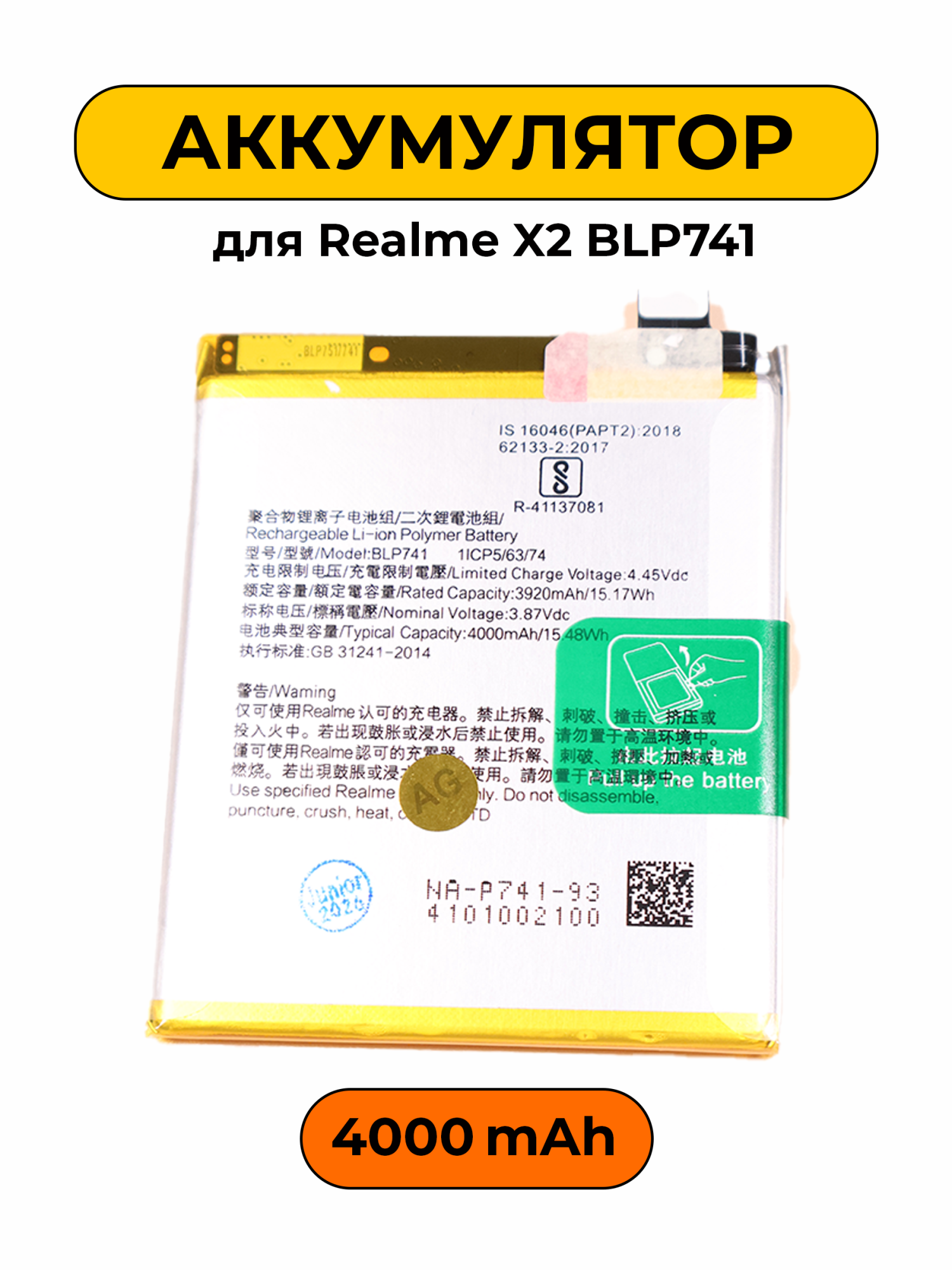 Аккумулятор для Realme X2 BLP741 имеет ёмкость 3920 mAh, что обеспечивает должную автономность вашего устройства. Эта деталь идеально подходит для пользователей, которым важно поддерживать работоспособность своего смартфона на высоком уровне. Он предназначен для замены старого или поврежденного аккумулятора, позволяя вашему телефону оставаться всегда на связи.
